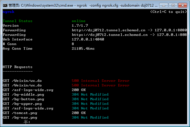 a.在dos中进入所在盘符执行ngrok -config ngrok.cfg -subdomain dzj0712 8080得到以下结果