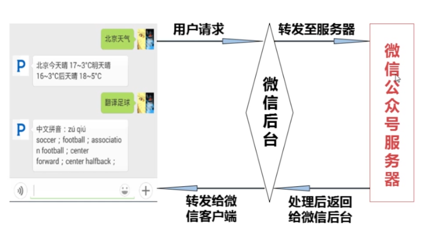 当用户发送请求之后,用户会进行解析公众号的地址,并根据该地址将请求转发至微信公众号服务器。服务器处理完成后会将处理的结果返回给微信后台,之后微信后台再将结果转发给客户端。