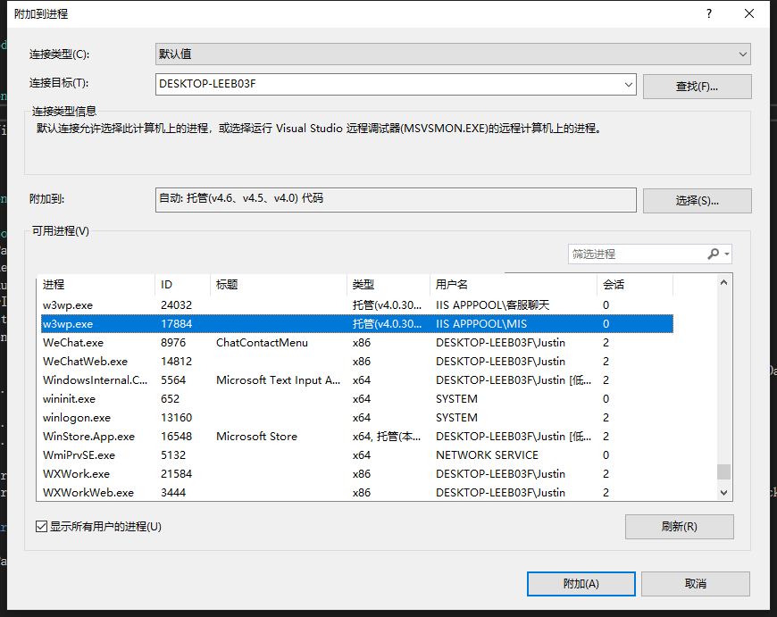 选择附加到进程,然后按shift+w找到问w3wp,.NetMVC的都是w3wp