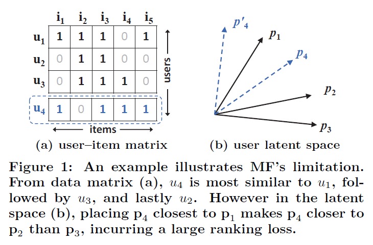 Matrix Factorization,MF 分解 user-item 矩阵,将 user 和 item 映射到低位隐空间中,但 MF 存在一些问题,作者举了一个例子: