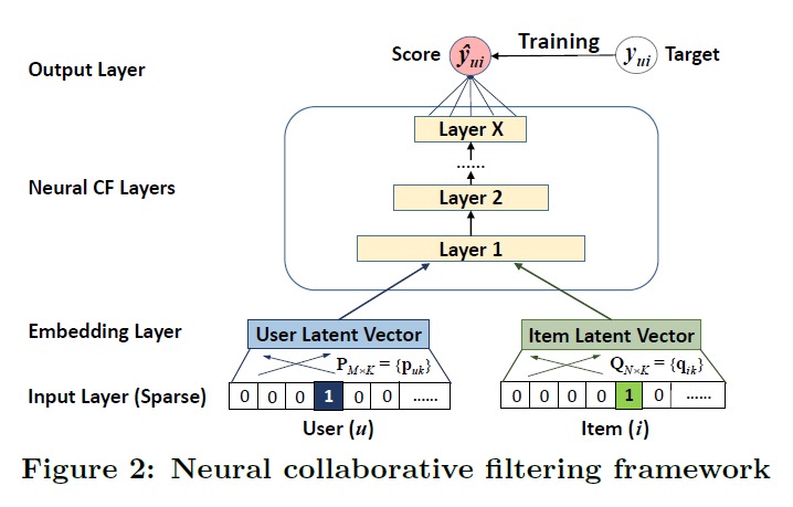 user 和 item 的隐向量内积,可以用来确定 user 对 item 的评分。有了 user 对各个 item 的评分,自然可以对 item 进行排序,得出推荐。但本篇论文认为,简单地使用隐向量内积,不足以捕获到复杂的交互行为特征,即评分并不一定是隐向量之积。本文通过引入神经网络,来学习用户与物品的隐向量和评分的关系。