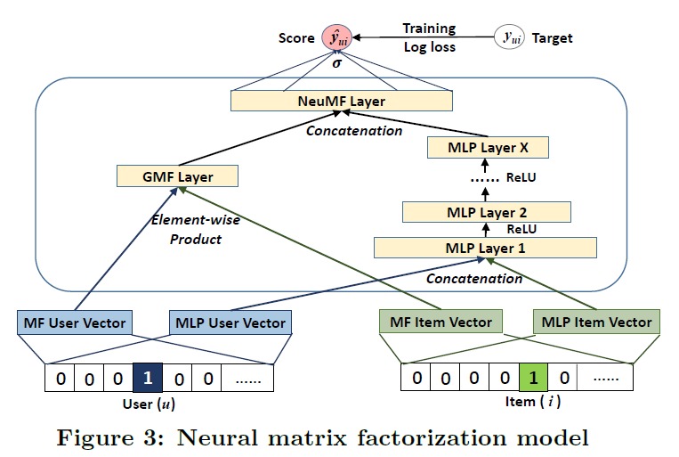 就是 MLP 和 GMF 的最后一层的向量拼接起来,然后交给 logistics regression。上图中好像 GMF 和 MLP 共用了一个 Embedding 一样。论文中说,共用 Embedding 需要 GMF 和 MLP 用相同的维度。学习单独的 Embedding 可能得到更好的集成效果。