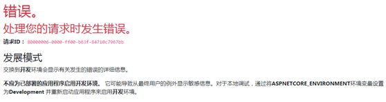 在项目中为测试设置特定环境通常很有用。 如果未设置环境,默认值为 Production,这会禁用大多数调试功能。设置环境的方法取决于操作系统。例如将asp.net core razor项目发布后,部署到IIS上,访问OtherPages/page1时出现异常。此时默认是Production 环境变量,会显示了error页面信息, 表示已启用友好错误页。如下图所示 :