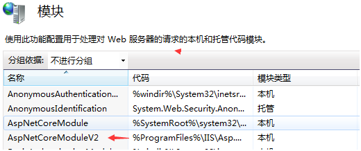 在里面找到“当前 .NET Core 托管捆绑包安装程序(直接下载)”这里进去可以下载到当前版本(aspnetcore-2.2),安装后,在iis模块中能看到AspNetCoreModuleV2。对应发布项目中web.config的<handlers>处理。