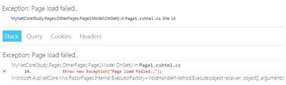 此时iis上该项目就是Development开发环境了,再次访问OtherPages/page1时出现异常,此时会捕获同步和异步系统。管道中的异常实例,并生成HTML错误响应。详细异常信息如下图所示: