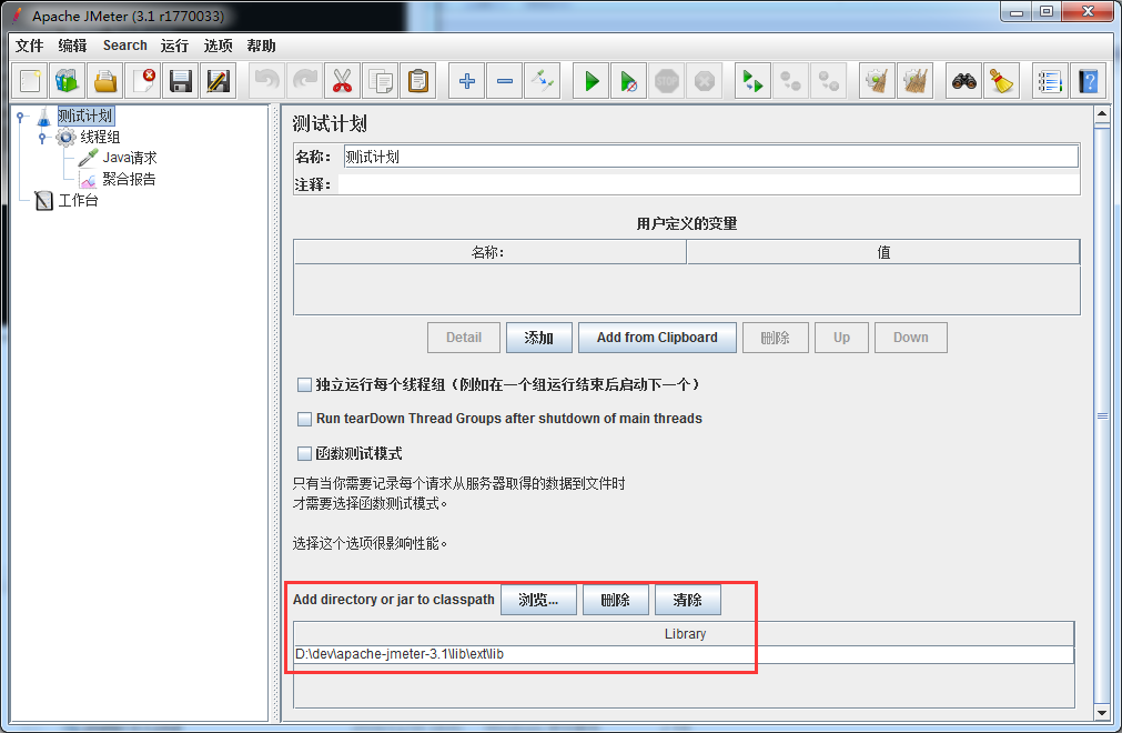 - 分开打包。打包时,将依赖 copy 至指定目录,然后将 jar 添加至 JMeter 的 ex t目录,最后在 JMeter 界面上指定依赖的 jar 包的目录。
