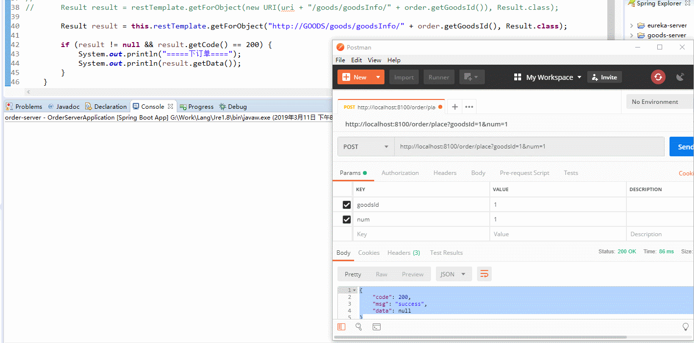 完成上边 3 个操作后,启动 3 台 goods-server 服务 和 order-server 服务,通过 Postman 进行测试,运行结果如下: