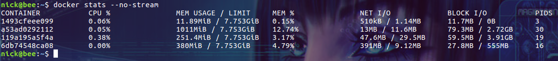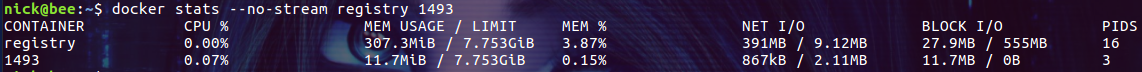 如果不想持续的监控容器使用资源的情况,可以通过 --no-stream 选项只输出当前的状态: