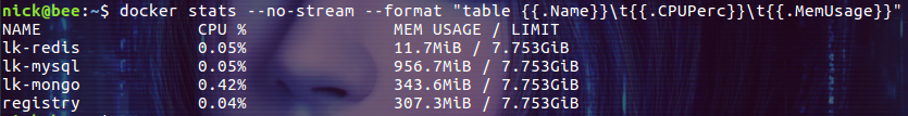 $ docker stats --format "table {{.Name}}\t{{.CPUPerc}}\t{{.MemUsage}}"