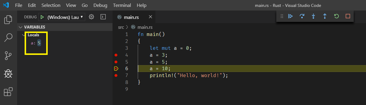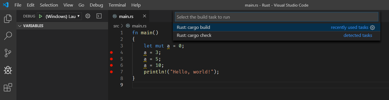 回到main.rs文件,按F9设置断点(也可能是我用了VS快键扩展),并且按Ctrl + Shift + B编译Build