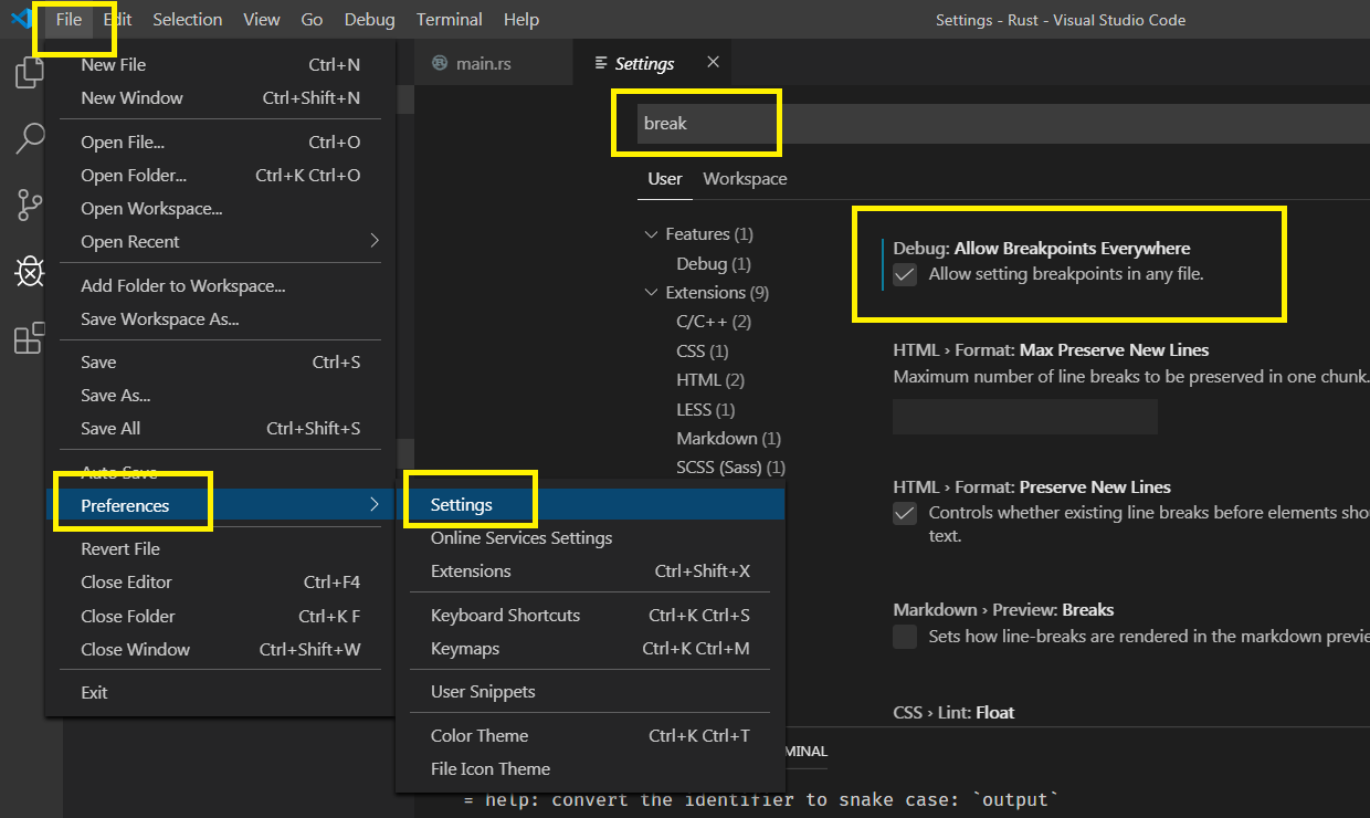 设置断点选项,菜单 File > Preferences > Setting中搜索break,勾选Allow setting breakpoints in any file