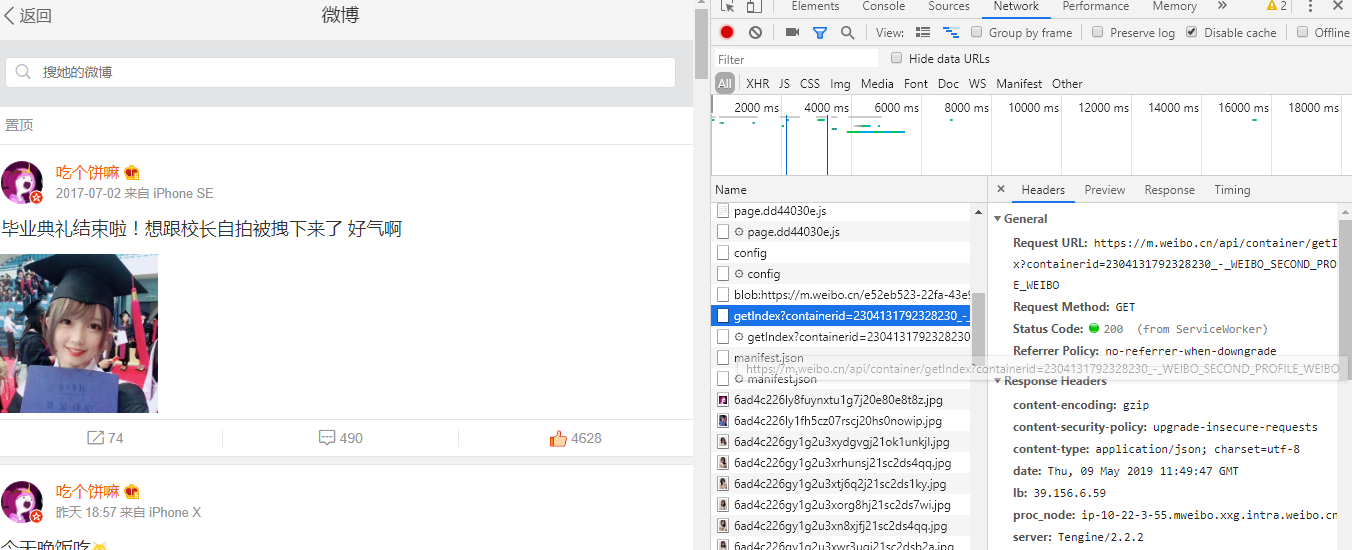 我之前去网上搜了一圈爬微博的爬虫大都是采用模拟登陆的方式爬取,我这里并没有采用那种方式,直接是通过模拟请求得到数据的。如下(爬取的微博:https://m.weibo.cn/profile/1792328230)