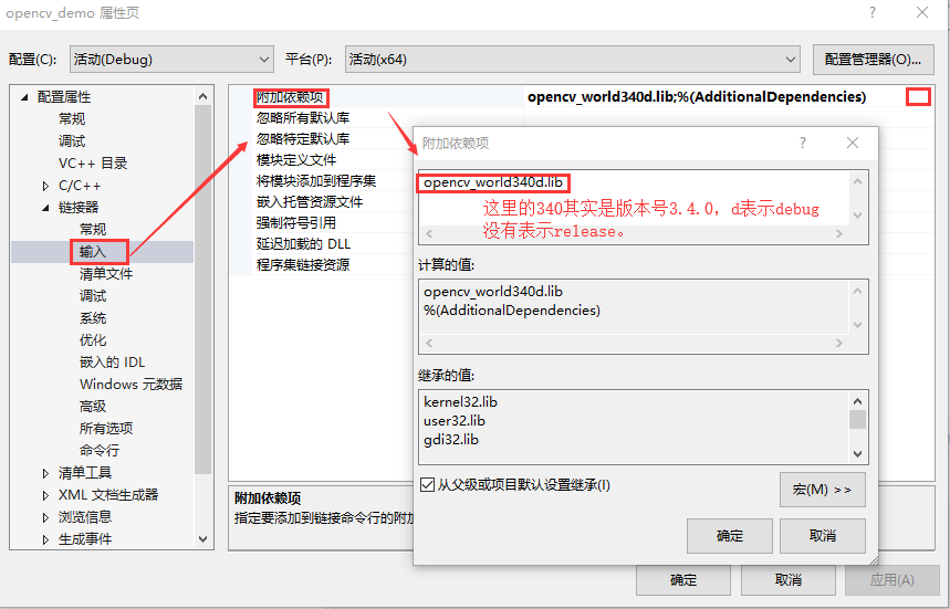 最后,链接器 -> 附加依赖项 -> 编辑,如下: