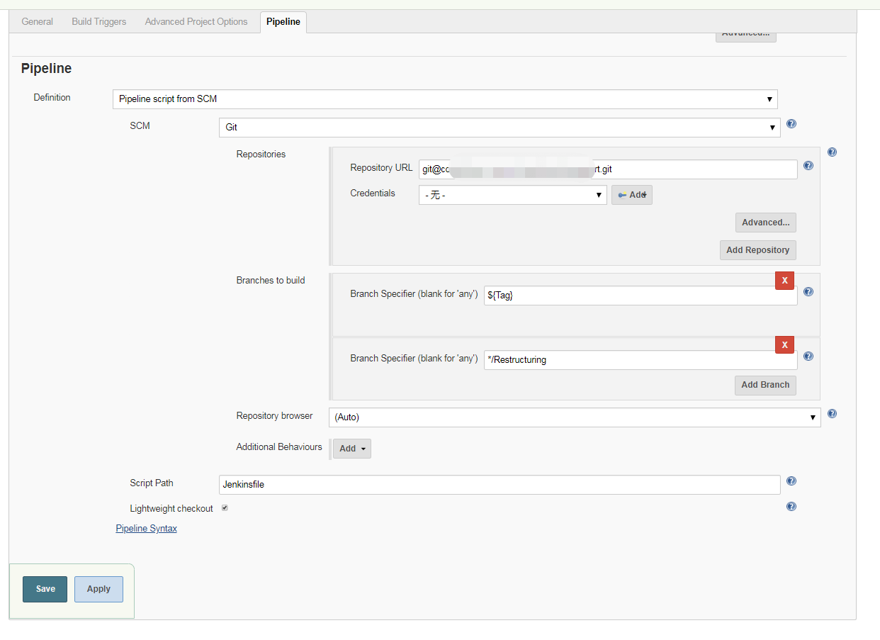 checkout([$class: 'GitSCM', branches: [[name: '${Tag}']], doGenerateSubmoduleConfigurations: false, extensions: [], submoduleCfg: [], userRemoteConfigs: [[url: 'git@code.aliyun.com:xx/xx.git']]]) } //代码编译