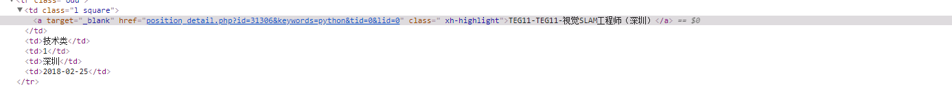 我们在chrome中打开Xpath Helper插件,右键检查元素,分析网页结构,我们可以用上图所示的方法提取到职位名称。但是提取不到类别和地址,经过分析后发现,隔行的class属性不一致。实际上在这里,我们可以爬下职位链接,然后进行深度爬取。