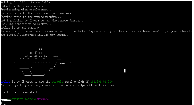 然后再次双击Docker Quickstart Terminal图标,出现如下界面,说明安装成功了。
