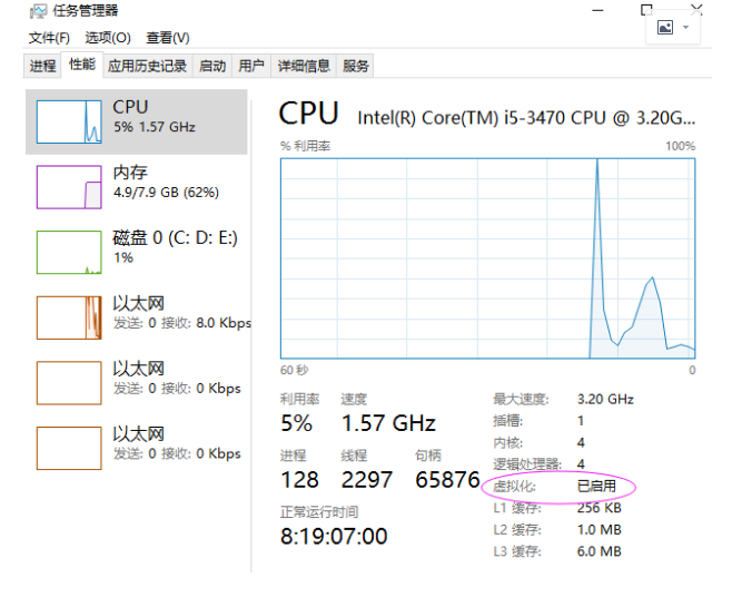 对于windows10系统来说,你可以在 任务管理器->性能 中查看到你的电脑是否开启了虚拟化