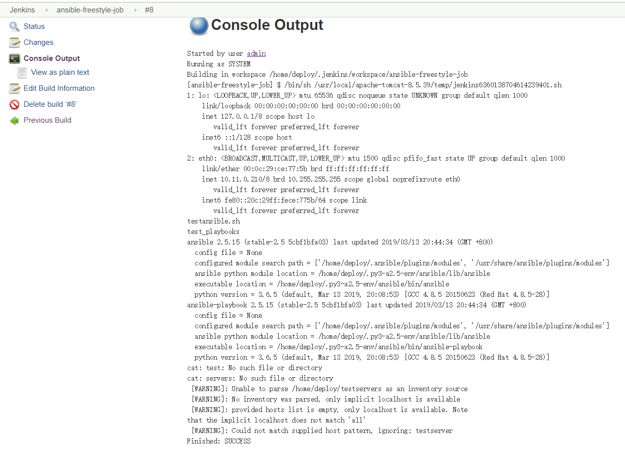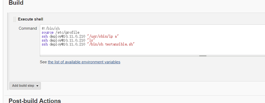# 通过jenkins服务器调用ansible(10.11.0.210)上的脚本执行ansible任务