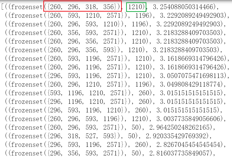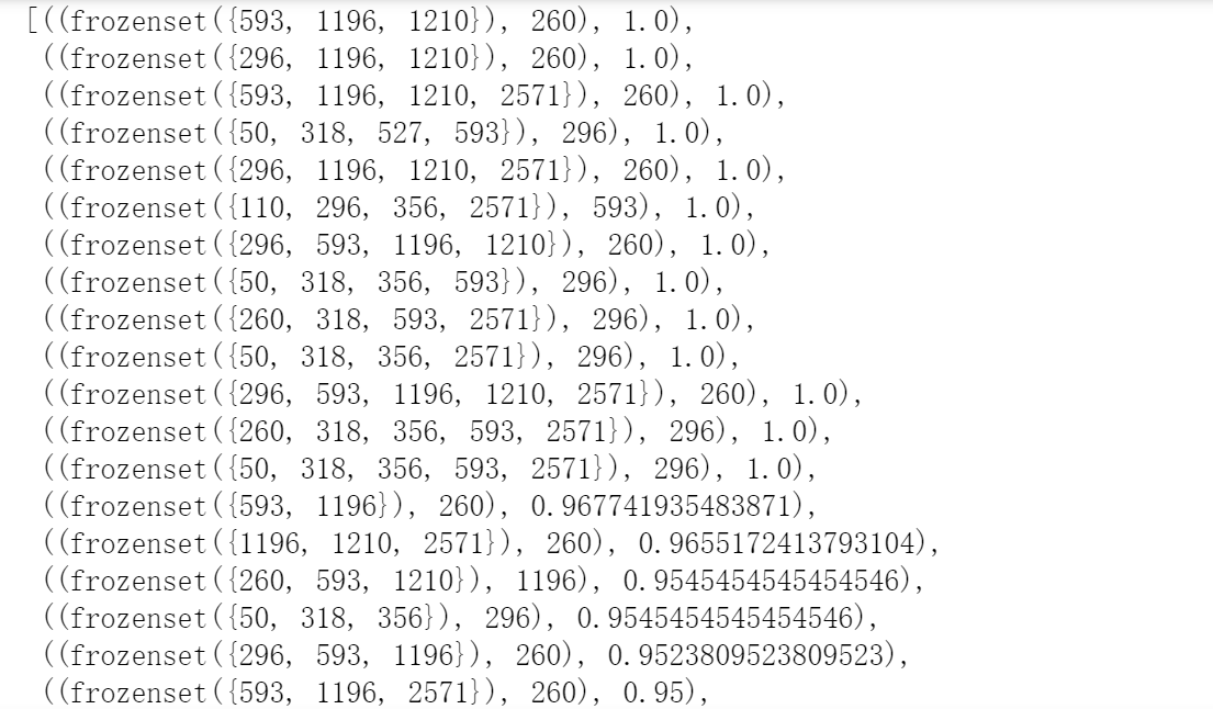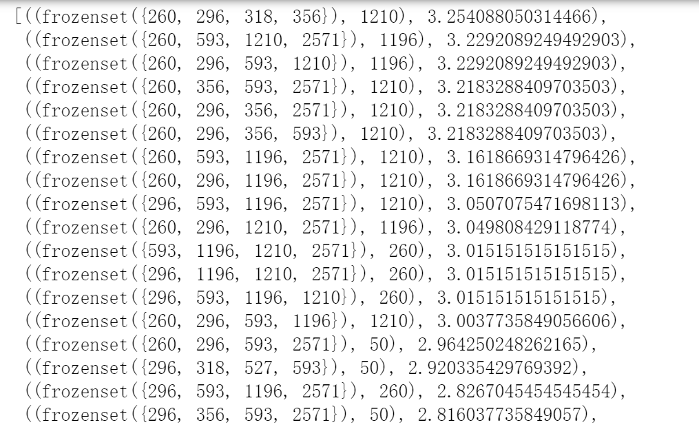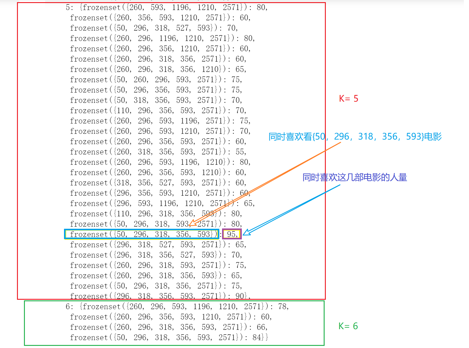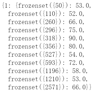 在frequent_itemsets[1]中间,key为movie_id的集合,value为集合中电影被喜欢的数量。
