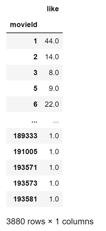 num_like_of_movie = like_ratings[["movieId", "like"]].groupby("movieId").sum()