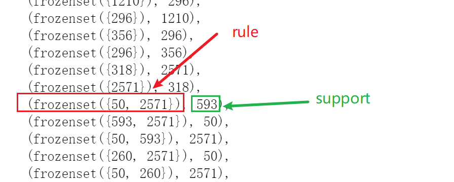我们使用lift最大的一项进行验证,也就是下图中被圈出来的部分。sort_lift[0][0][0]表示的是下图中红色框框圈出来的,sort_lift[0][0][1]表示是由绿色框框圈出来的。
