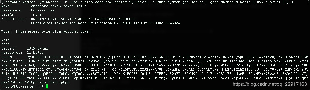 [root@k8s-master ~]# kubectl -n kube-system describe secret $(kubectl -n kube-system get secret | grep dasboard-admin | awk '{print $1}')