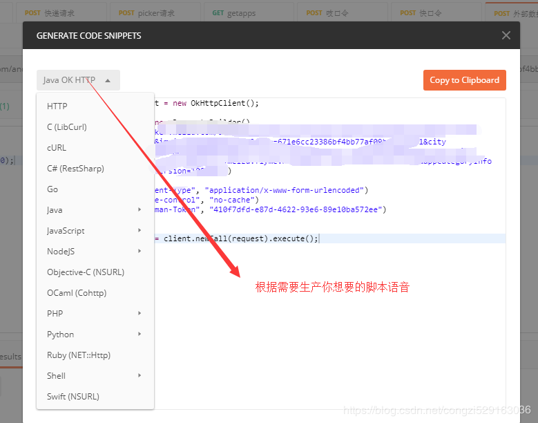postman除了进行接口测试外还能生成支持多种语言的request代码,方便使用,步骤如下: