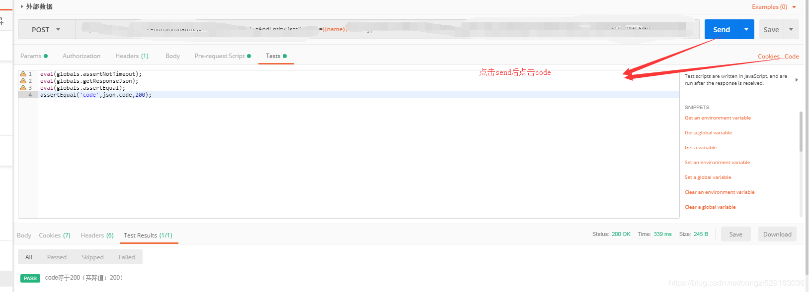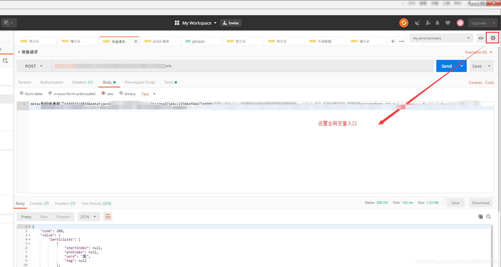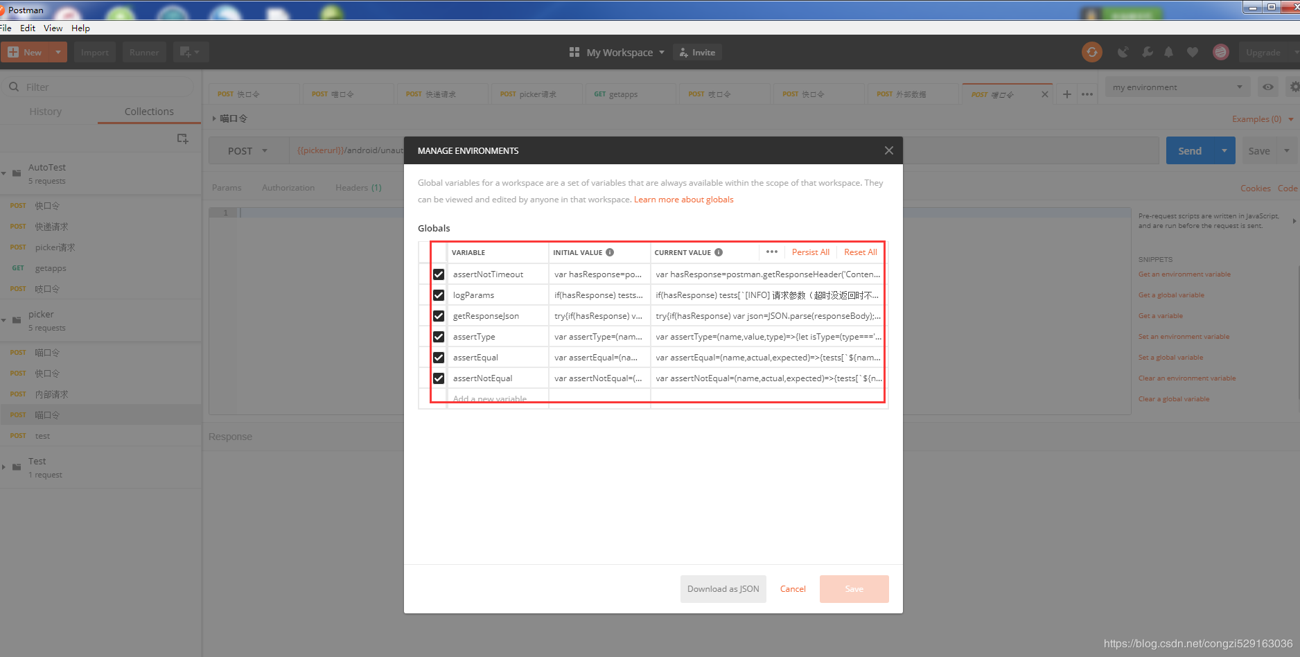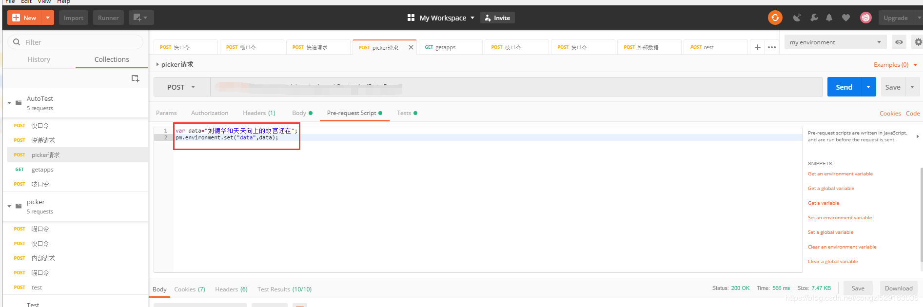 请求数据准备完成后,开始编写测试脚本,测试脚本根据自己需要编写,以下仅供参考。全局变量使用方法如下: