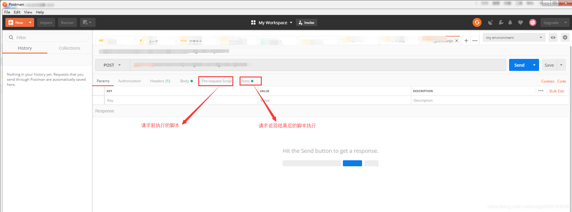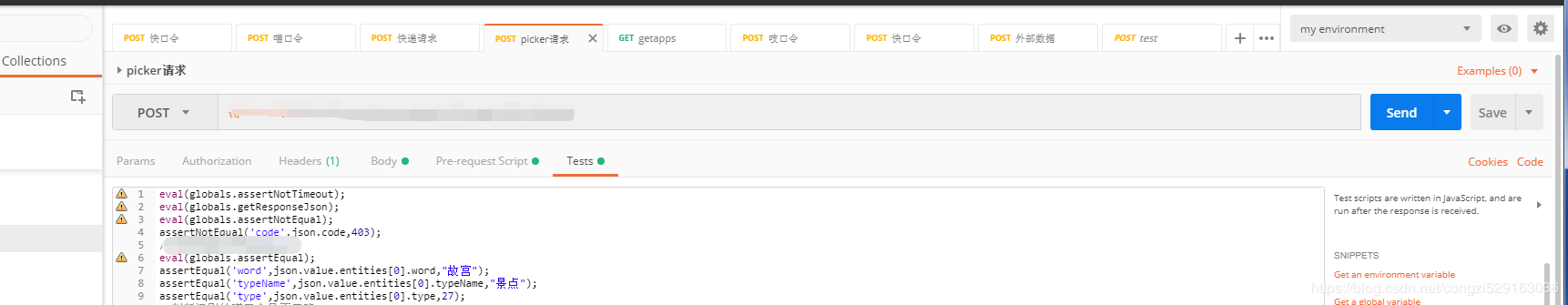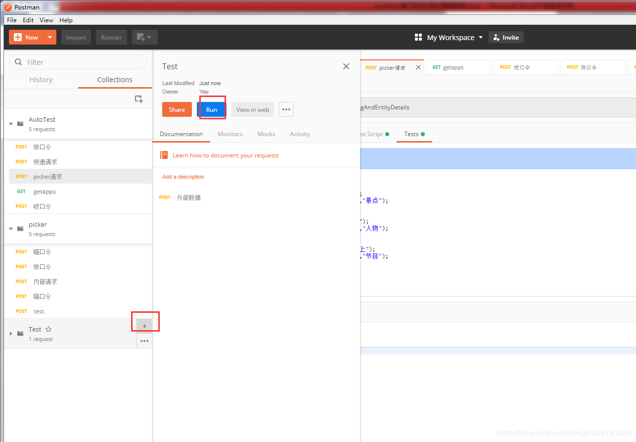 通过左边菜单栏创建接口测试用例,主要代码编写区域为pre-requestScript和Tests,如图: