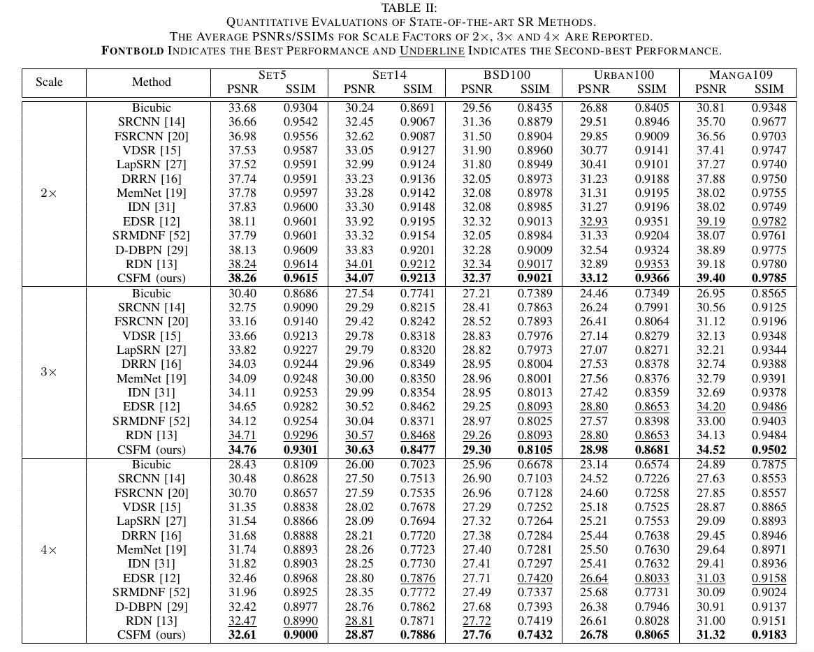 在 PSNR 和 SSIM 指标上,CSFM 在所有的数据集上都取得了最好的效果。