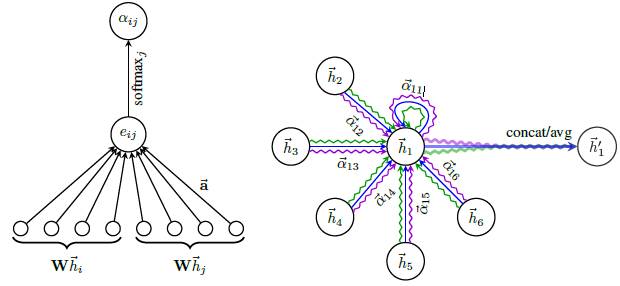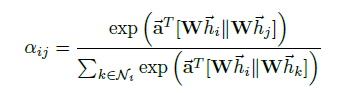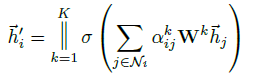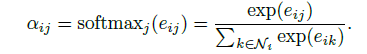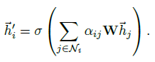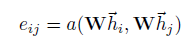 给定图上所有节点在当前层的输入h,假设我们当前需要更新节点i的表示,j表示节点i的一个邻居。那么节点j对i的重要性系数的计算公式如下: