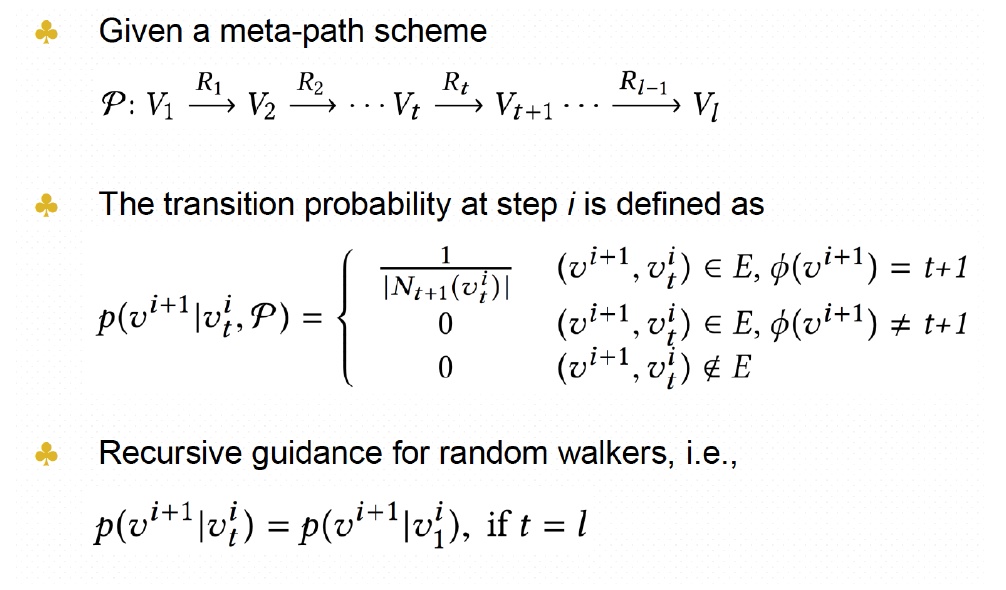 论文提出的想法是:基于预先指定的元路径来进行随机游走来进行随机游走,构造路径,从而能够保持“节点上下文”的概念。
