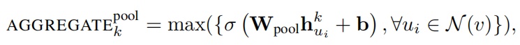 - Pooling Aggregator: 邻接特征经过线性变换化取各个位置上对最大值。