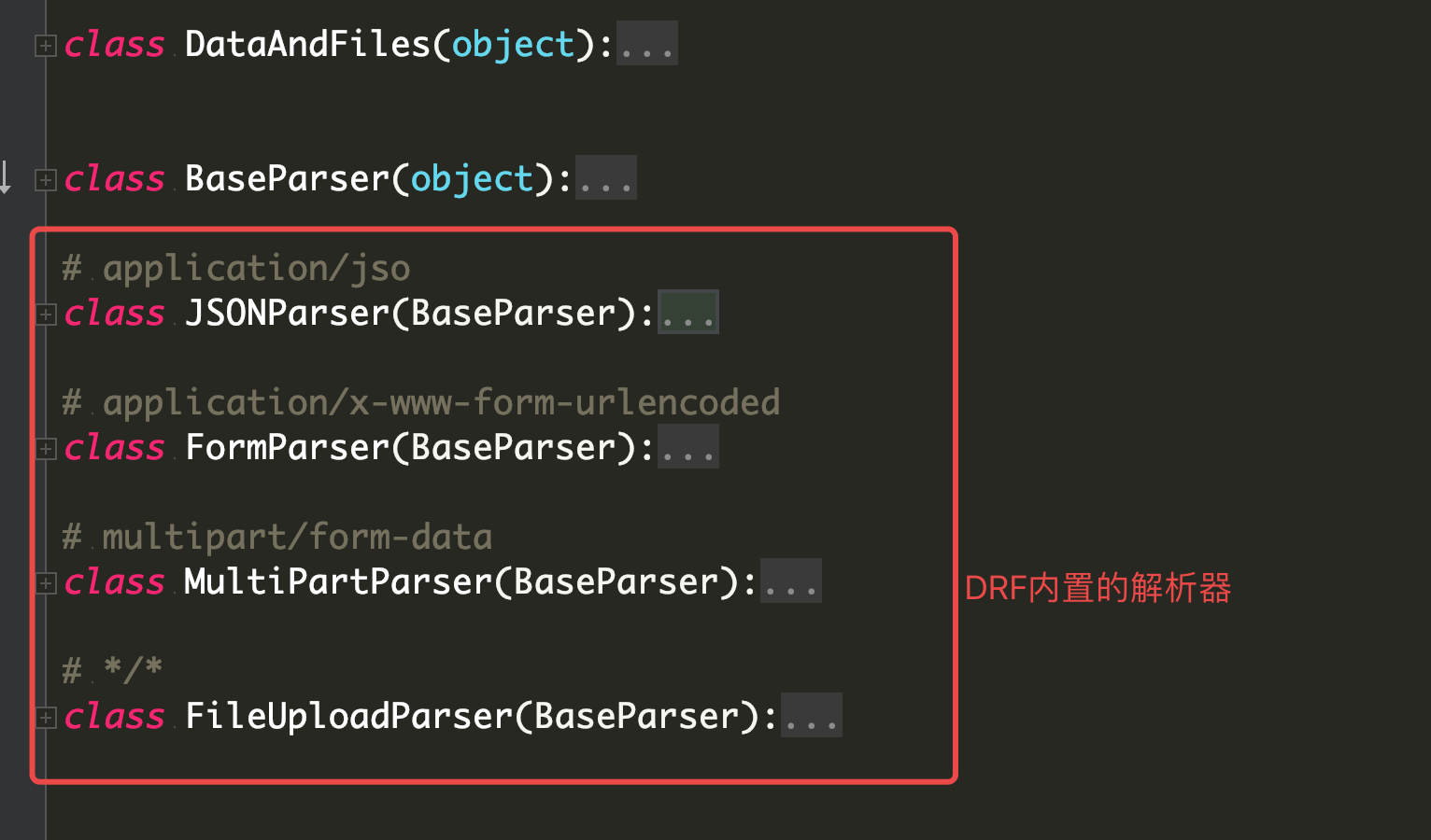 REST 框架包括一些内置的Parser类,允许你接受各种媒体类型的请求。还支持定义自己的自定义解析器,这使你可以灵活地设计API接受的媒体类型。