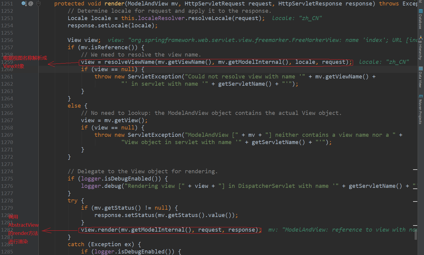 View作为视图接口,AbstractView的render方法创建待渲染的model,调用子类,如果待解析视图类型是jsp,则调用InternalResourceView,如果是ftl,则调用FreemarkerView,执行渲染