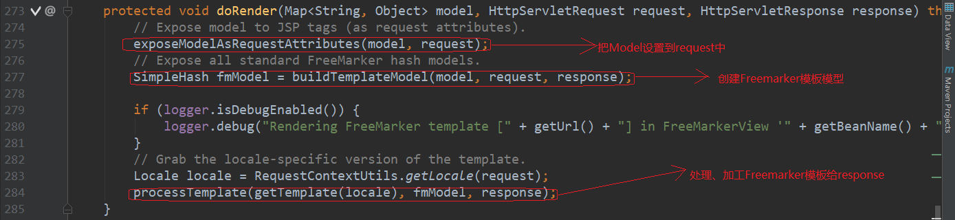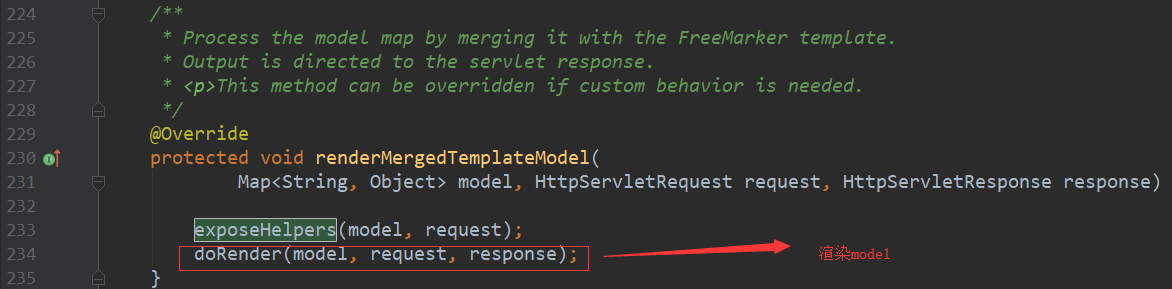 AbstractTemplateView的renderMergedOutputModel方法会调用内部renderMergedTemplateModel方法,该方法被子类FreemarkerView实现
