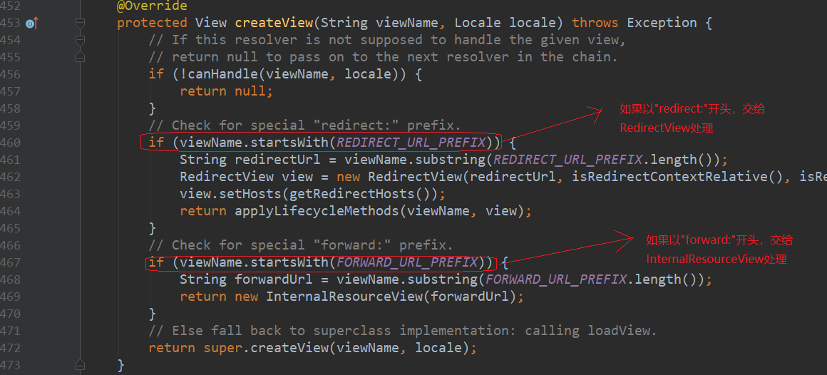 467行如果以"forward:"开头,交给InternalResourceView处理