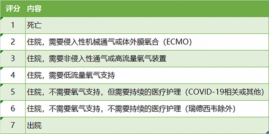 根据患者状态进行评分,从死亡(1分)到出院(7分)分为7个不同等级,患者以接受治疗时的评分为基准评分,评分提高2分及以上的被认为是产生了“临床改善”。