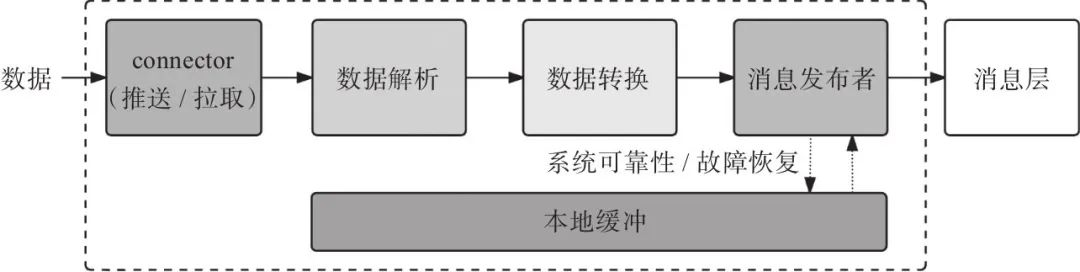 为了确保该层的安全性,它应该能够支持本地持久化的消息缓冲,这样,如果需要,并且当消息层再次可用时,消息可以从本地缓冲区中恢复。该模块还应该支持故障转移,如果其中一个数据获取进程失败,另一个进程将无缝接管,如下图所示。