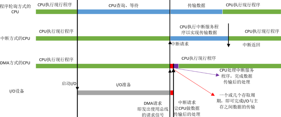 以往的I/O设备和主存交换信息都要经过CPU的操作。不论是最早的轮询方式,还是我们学过的中断方式。虽然中断方式相比轮询方式已经节省了大量的CPU资源。但是在处理大量的数据时,DMA相比中断方式进一步解放了CPU。