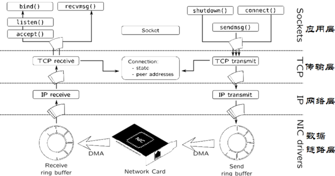 网卡通过DMA方式将数据发送到Receive Ring Buffer,然后Receive Ring Buffer把数据包传给IP协议所在的网络层,然后再由路由机制传给TCP协议所在的传输层,最终传给用户进程所在的应用层。下一节在数据链路层上分析具体分析网卡是如何处理数据包的。