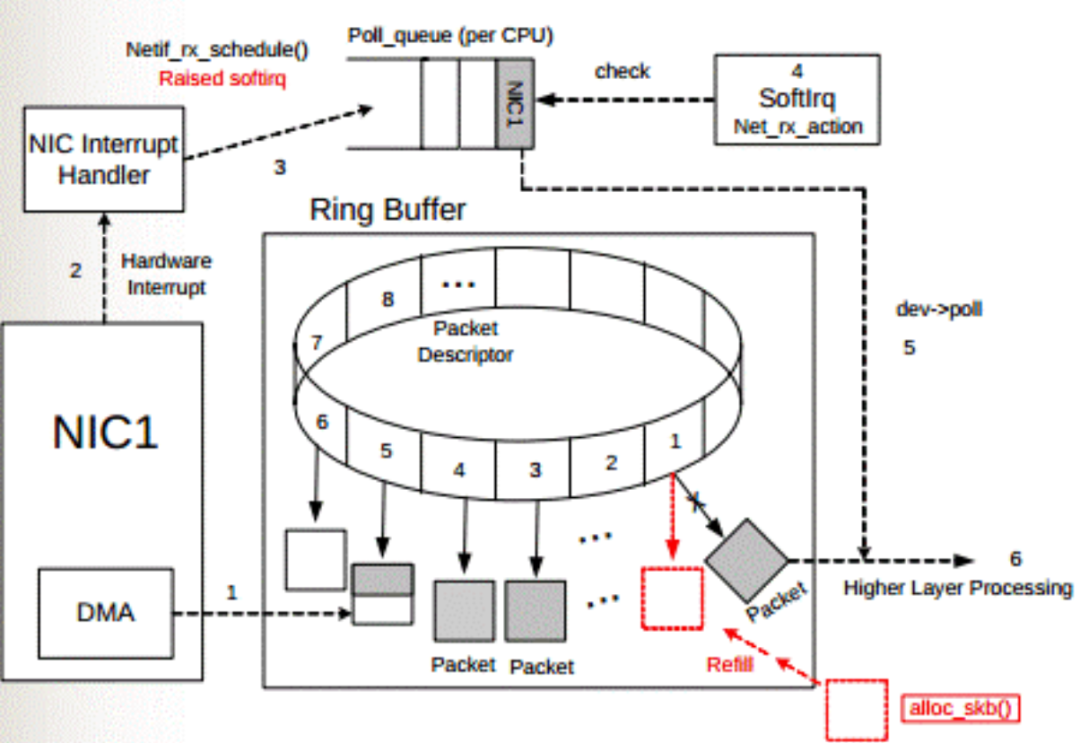 1.DMA 接口将网卡(NIC)接收的数据包(packet)逐个写入 sk_buff ,被写入数据的 sk_buff 变为 used 状态。一个数据包可能占用多个 sk_buff , sk_buff读写顺序遵循先入先出(FIFO)原则。