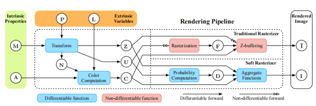 该框架(上)将渲染描述为一个可微的聚合过程A(·),以“软”概率的方式融合每个三角形贡献Di。这个方法还解决了标准光栅化器的核心问题,即由于离散采样操作,标准光栅化器无法将梯度从像素流到几何体(下)。