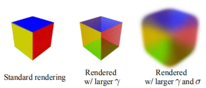 由SoftRas生成的各种渲染效果,通过分别调整γ和σ,可以获得不同程度的透明度和模糊度