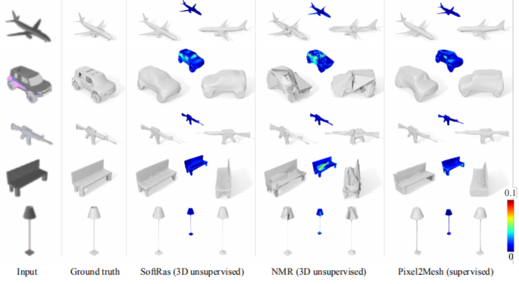 从单个图像重建三维网格,从左到右分别是输入图像、真实值、SoftRas、Neural Mesh Renderer和Pixel2mesh
