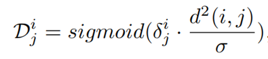 2.概率图计算:利用概率图Dj模拟三角fj对图像平面的影响。为了估计像素Pi处Dj的概率,函数需要同时考虑Pi与Dj之间的相对位置和距离。为此,在像素Pi处定义Dj如下所示: