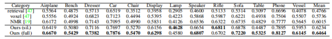 13类ShapeNet数据的平均IoU与其他三维无监督重建方法的比较