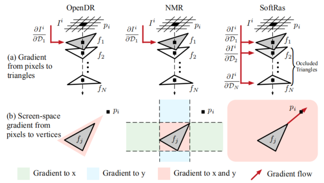 由于OpenDR和NMR都在前向过程中使用标准图形渲染器,因此它们无法控制中间渲染过程,并且无法将梯度流到最终渲染图像中被遮挡的三角形中。与此相反,该方法完全控制了内部变量,并且能够通过聚合函数将梯度流到不可见三角形中。