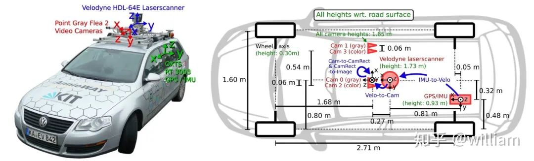 如上图所示这辆帕萨特配备了两个前置灰度摄像头和两个彩色摄像头, 一个安装在车顶上的Velodyne Lidar以及一个惯性测量单元或IMU. 现在KIT MRT所的最新的自动驾驶车辆是奥迪Q7, 传感器布置基本相似.