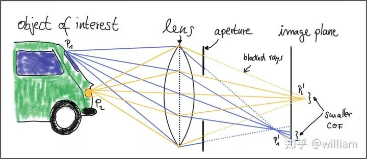 而物体上较近或较远的点却不会聚在图像平面上, 因为它们发出的光线不是会聚在一个点上, 而是会聚在一个半径有限的圆上. 这种模糊的圈子通常称为 circle of confusion (COF). 为了减少模糊, 可以使用光圈, 该光圈是通常可调大小的同心开口, 直接位于镜头后面. 下图说明了原理: